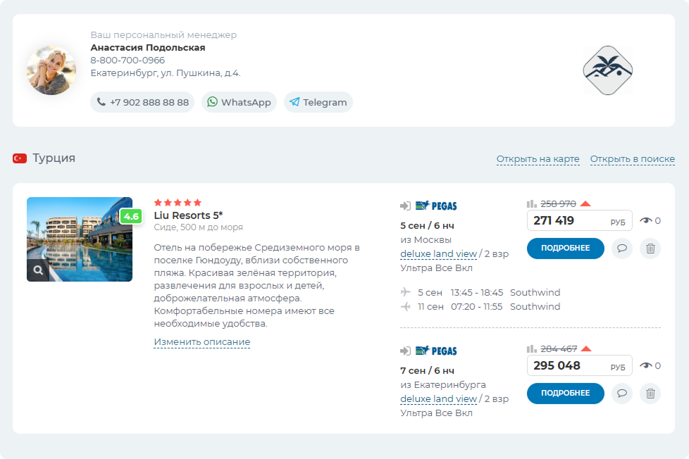Время рейсов продолжит актуализироваться, как и цена тура, даже после отправки клиенту